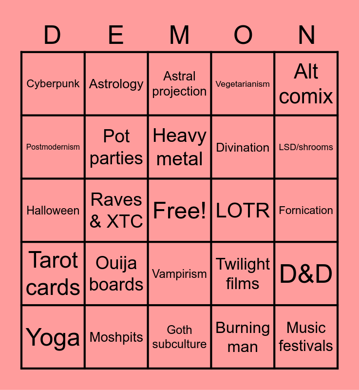 This bingo card has a free space and 24 words: Yoga, Ouija boards, Heavy metal, Burning man, Alt comix, Cyberpunk, Astrology, Astral projection, LOTR, Fornication, Halloween, Pot parties, Twilight films, D&D, Postmodernism, Moshpits, Goth subculture, Vegetarianism, LSD/shrooms, Tarot cards, Raves & XTC, Vampirism, Divination and Music festivals.
