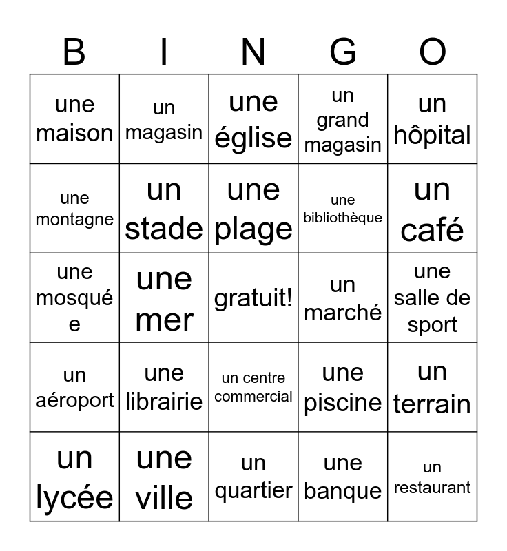 This bingo card has a free space and 24 words: une librairie, une ville, une plage, un lycée, un hôpital, une maison, une montagne, un magasin, un marché, un centre commercial, une bibliothèque, une mosqué e, une piscine, un terrain, un stade, une banque, une salle de sport, une église, un café, une mer, un restaurant, un aéroport, un grand magasin and un quartier.