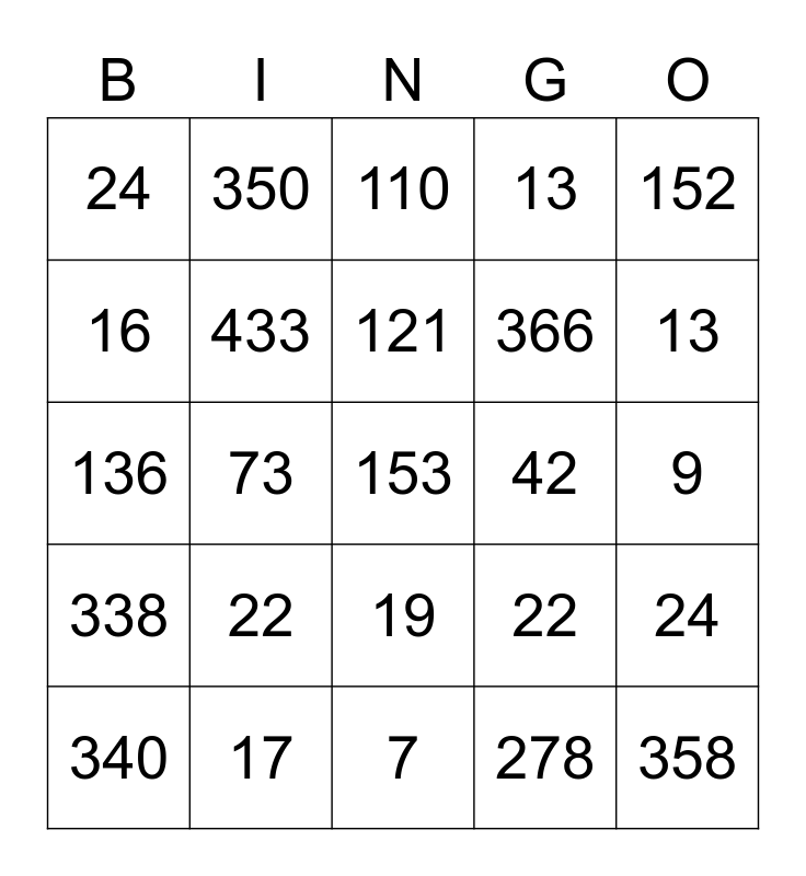 This bingo card has a free space and 34 words: 145, 278, 325, 200, 338, 433, 152, 340, 350, 299, 121, 110, 24, 10, 42, 13, 17, 136, 22, 22, 19, 17, 24, 9, 7, 358, 13, 142, 366, 16, 103, 73, 24 and 15.