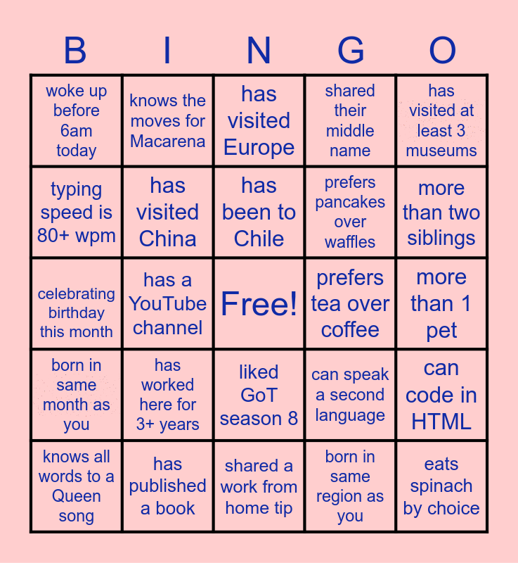 This bingo card has 2 images, a free space and 24 words: has worked here for 3+ years, has published a book, has been to Chile, knows all words to a Queen song, has visited at least 3 museums, woke up before 6am today, typing speed is 80+ wpm, knows the moves for Macarena, prefers tea over coffee, liked GoT season 8, prefers pancakes over waffles, celebrating birthday this month, can speak a second language, can code in HTML, has visited China, born in same region as you, more than 1 pet, has visited Europe, more than two siblings, has a YouTube channel, eats spinach by choice, born in same month as you, shared their middle name and shared a work from home tip.