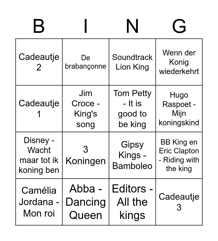 This bingo card has 16 words: Abba - Dancing Queen, BB King en Eric Clapton - Riding with the king, Soundtrack Lion King, Cadeautje 2, Disney - Wacht maar tot ik koning ben, De brabançonne, Gipsy Kings - Bamboleo, Editors - All the kings, Cadeautje 1, Jim Croce - King's song, Camélia Jordana - Mon roi, Wenn der Konig wiederkehrt, 3 Koningen, Hugo Raspoet - Mijn koningskind, Tom Petty - It is good to be king and Cadeautje 3.