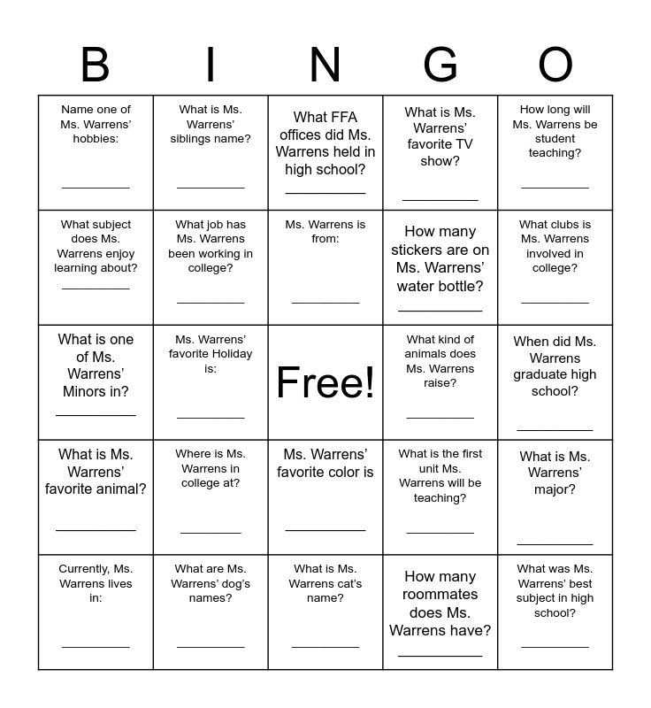 This bingo card has a free space and 24 words: Where is Ms. Warrens in college at? _________, What are Ms. Warrens’ dog’s names? __________, Ms. Warrens is from: __________, Currently, Ms. Warrens lives in: __________, How long will Ms. Warrens be student teaching? __________, Name one of Ms. Warrens’ hobbies: __________, What subject does Ms. Warrens enjoy learning about? __________, What is Ms. Warrens’ siblings name? __________, What kind of animals does Ms. Warrens raise? __________, Ms. Warrens’ favorite color is __________, How many stickers are on Ms. Warrens’ water bottle? __________, What is one of Ms. Warrens’ Minors in? __________, What is the first unit Ms. Warrens will be teaching? __________, What is Ms. Warrens’ major? __________, What job has Ms. Warrens been working in college? __________, How many roommates does Ms. Warrens have? __________, When did Ms. Warrens graduate high school? __________, What FFA offices did Ms. Warrens held in high school? __________, What clubs is Ms. Warrens involved in college? __________, Ms. Warrens’ favorite Holiday is: __________, What was Ms. Warrens’ best subject in high school? __________, What is Ms. Warrens’ favorite animal? __________, What is Ms. Warrens’ favorite TV show? __________ and What is Ms. Warrens cat’s name? __________.