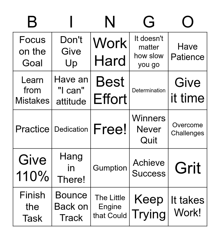 This bingo card has a free space and 24 words: Hang in There!, Bounce Back on Track, Best Effort, Finish the Task, Have Patience, Focus on the Goal, Learn from Mistakes, Don't Give Up, Winners Never Quit, Gumption, Determination, Practice, Achieve Success, Grit, Have an "I can" attitude, Keep Trying, Overcome Challenges, Work Hard, Give it time, Dedication, It takes Work!, Give 110%, It doesn't matter how slow you go and The Little Engine that Could.