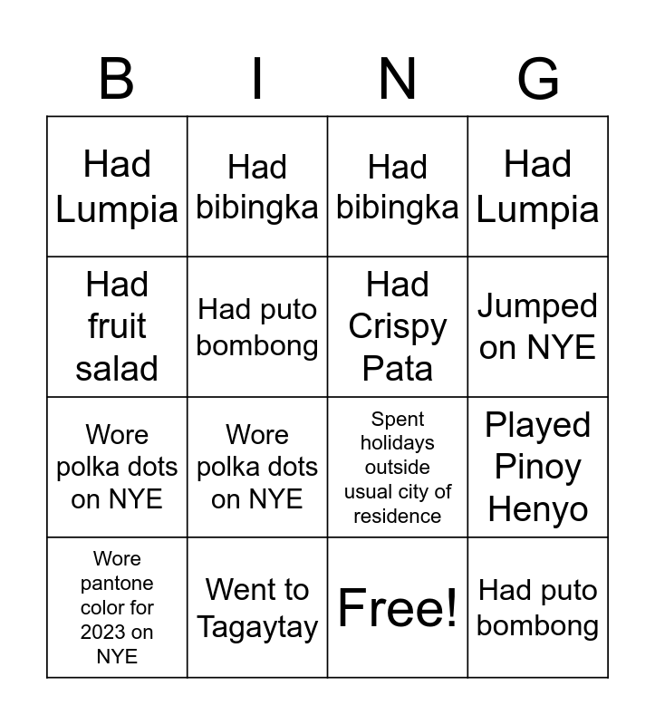 ⚠ This card has duplicate items: Went to Baguio (2), Went to Tagaytay (2), Jumped on NYE (2), Had Crispy Pata (2), Had fruit salad (2), Had Lumpia (2), Had puto bombong (2), Had bibingka (2), Wore pantone color for 2023 on NYE (2), Wore polka dots on NYE (2)