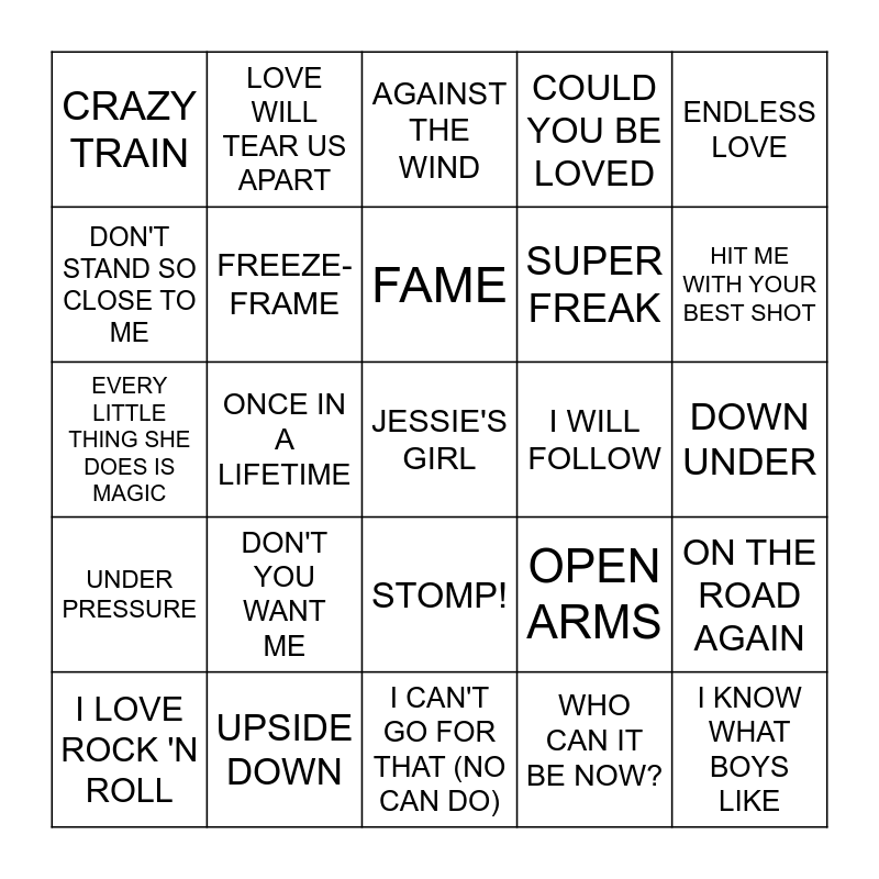 This bingo card has 80 words: 867-5309/JENNY, ACE OF SPADES, AGAINST THE WIND, ALL OUT OF LOVE, ANOTHER ONE BITES THE DUST, ANY WAY YOU WANT IT, BABY' COME TO ME, BACK IN BLACK, BETTE DAVIS EYES, CALL ME, CELEBRATION, CENTERFOLD, COULD YOU BE LOVED, CRAZY TRAIN, DANCING WITH MYSELF, DON'T STAND SO CLOSE TO ME, DON'T STOP BELIEVIN', DON'T YOU WANT ME, DOUBLE DUTCH BUS, DOWN UNDER, EDGE OF SEVENTEEN, ENDLESS LOVE, EVERY LITTLE THING SHE DOES IS MAGIC, FAME, FREEZE-FRAME, GENIUS OF LOVE, GET DOWN ON IT, GIRLS ON FILM, GIVE IT TO ME BABY, HEY MICKEY, HIT ME WITH YOUR BEST SHOT, HUNGRY HEART, I CAN'T GO FOR THAT (NO CAN DO), I KNOW WHAT BOYS LIKE, I LOVE ROCK 'N ROLL, I WILL FOLLOW, I'M COMING OUT, IN THE AIR TONIGHT, IT'S STILL ROCK AND ROLL TO ME, JESSIE'S GIRL, JUST CAN'T GET ENOUGH, KEEP ON LOVING YOU, KIDS IN AMERICA, LET MY LOVE OPEN THE DOOR, LET'S GROOVE, LOVE WILL TEAR US APART, MASTER BLASTER, MISUNDERSTANDING, MONY MONY, NEVER KNEW LOVE LIKE THIS BEFORE, ON THE ROAD AGAIN, ONCE IN A LIFETIME, OPEN ARMS, OUR LIPS ARE SEALED, PHYSICAL, RAPTURE, ROCK THIS TOWN, SHAKE IT UP, START ME UP, STOMP!, SUPER FREAK, TAINTED LOVE, TAKE YOUR TIME (DO IT RIGHT), TEMPTED, THE BREAKS, THE SPIRIT OF RADIO, THE STROKE, THE TIDE IS HIGH, TOM SAWYER, TURNING JAPANESE, UNDER PRESSURE, UPSIDE DOWN, URGENT, WAITING FOR A GIRL LIKE YOU, WE GOT THE BEAT, WHIP IT, WHO CAN IT BE NOW?, WORKING FOR THE WEEKEND, YOU MAY BE RIGHT and YOU SHOOK ME ALL NIGHT LONG.