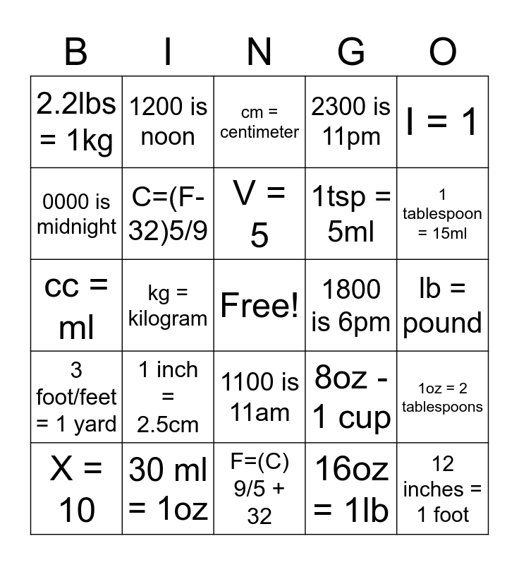 This bingo card has a free space and 24 words: 1 inch = 2.5cm, 30 ml = 1oz, V = 5, X = 10, I = 1, 2.2lbs = 1kg, 0000 is midnight, 1200 is noon, 1800 is 6pm, 1100 is 11am, 1tsp = 5ml, cc = ml, 8oz - 1 cup, 1oz = 2 tablespoons, C=(F-32)5/9, 16oz = 1lb, lb = pound, cm = centimeter, 1 tablespoon = 15ml, kg = kilogram, 12 inches = 1 foot, 3 foot/feet = 1 yard, 2300 is 11pm and F=(C) 9/5 + 32.