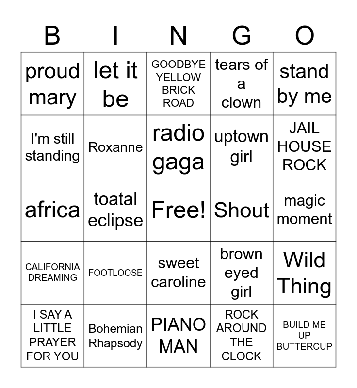 This bingo card has a free space and 59 words: Jump, Bohemian Rhapsody, Candle in the Wind, Eye of the Tiger, Wild Thing, Thriller, Roxanne, Betty DAVIS EYES, Shout, Twist, I'm still standing, everyone wants to rule the world, uptown girl, knock on wood, purple rain, let it be, radio gaga, tears of a clown, don't stop believing, africa, toatal eclipse, GOODBYE YELLOW BRICK ROAD, dancing in the streets, magic moment, runaround sue, celebration, sweet caroline, here comes the sun, stand by me, sugar sugar, the lion sleeps tonight, sweet child of mine, disco inferno, conga, proud mary, house of the rising sun, superstition, brown eyed girl, pretty woman, CALIFORNIA DREAMING, COME TOGETHER, PIANO MAN, ROCK AROUND THE CLOCK, IT'S MY PARTY, MY GIRL, ABC 123, I WILL SURVIVE, HOUND DOG, JAIL HOUSE ROCK, I SAY A LITTLE PRAYER FOR YOU, BORN IN THE USA, SITTING ON THE DOCK OF THE BAY, BEAT IT, BUILD ME UP BUTTERCUP, SHOTGUN, FOOTLOOSE, FUNKYTOWN, IT'S RAINING MEN and LOVE SHACK.