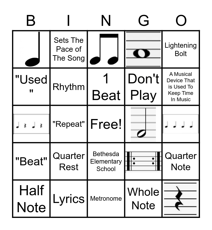 This bingo card has 8 images, a free space and 16 words: Quarter Rest, Lyrics, 1 Beat, Half Note, Lightening Bolt, "Used ", Sets The Pace of The Song, Bethesda Elementary School, Don't Play, Quarter Note, Rhythm, Whole Note, A Musical Device That is Used To Keep Time In Music, "Repeat", "Beat" and Metronome.