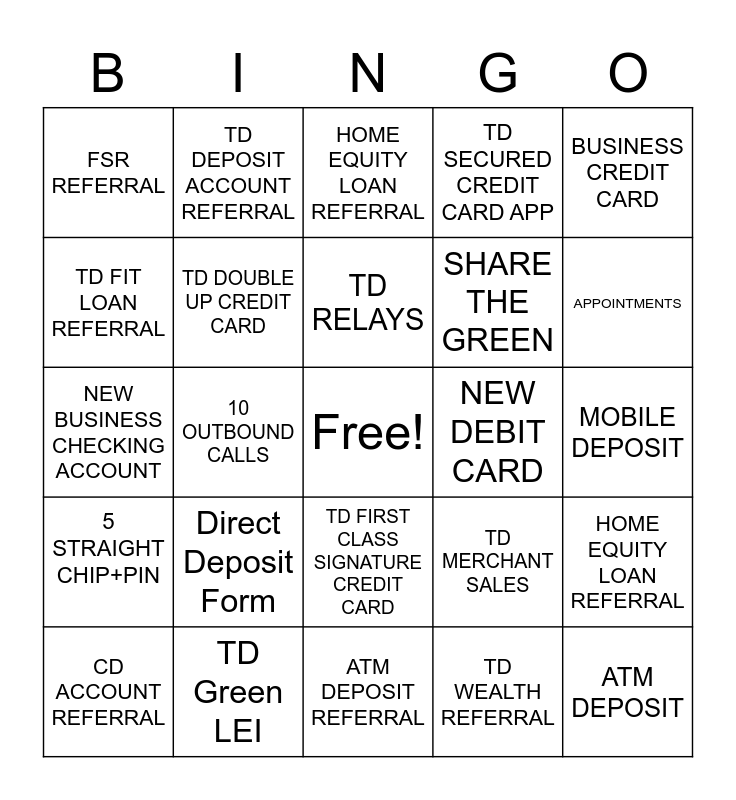 This bingo card has a free space and 24 words: Direct Deposit Form, TD Green LEI, TD RELAYS, CD ACCOUNT REFERRAL, BUSINESS CREDIT CARD, FSR REFERRAL, TD FIT LOAN REFERRAL, TD DEPOSIT ACCOUNT REFERRAL, NEW DEBIT CARD, TD FIRST CLASS SIGNATURE CREDIT CARD, SHARE THE GREEN, NEW BUSINESS CHECKING ACCOUNT, TD MERCHANT SALES, HOME EQUITY LOAN REFERRAL, TD DOUBLE UP CREDIT CARD, TD WEALTH REFERRAL, MOBILE DEPOSIT, HOME EQUITY LOAN REFERRAL, APPOINTMENTS, 10 OUTBOUND CALLS, ATM DEPOSIT, 5 STRAIGHT CHIP+PIN, TD SECURED CREDIT CARD APP and ATM DEPOSIT REFERRAL.