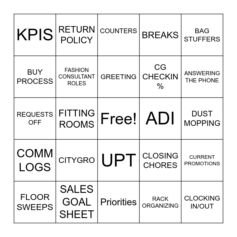 This bingo card has a free space and 24 words: CITYGRO, SALES GOAL SHEET, GREETING, FLOOR SWEEPS, BAG STUFFERS, KPIS, BUY PROCESS, RETURN POLICY, ADI, UPT, CG CHECKIN %, REQUESTS OFF, CLOSING CHORES, CURRENT PROMOTIONS, FASHION CONSULTANT ROLES, RACK ORGANIZING, DUST MOPPING, COUNTERS, ANSWERING THE PHONE, FITTING ROOMS, CLOCKING IN/OUT, COMM LOGS, BREAKS and Priorities.