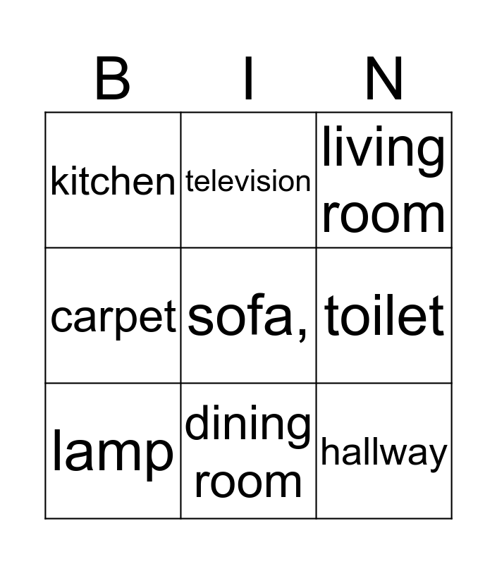 This bingo card has 15 words: bathroom, bedroom, living room, kitchen, dining room, sofa,, dining table, chair, toilet, hallway, bed, carpet, lamp, television and desk.