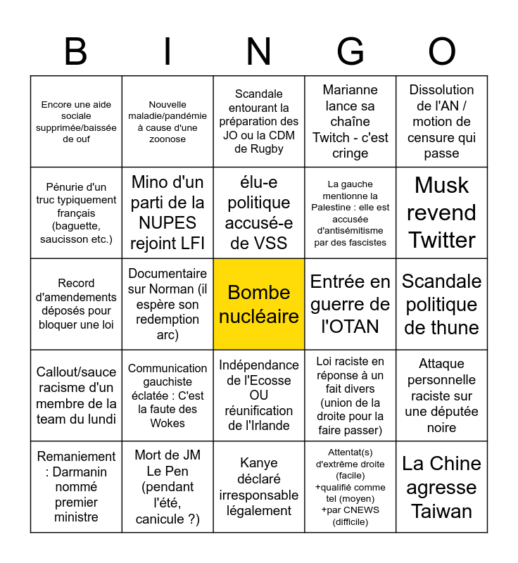 This bingo card has a free space and 24 words: Communication gauchiste éclatée : C'est la faute des Wokes, Mort de JM Le Pen (pendant l'été, canicule ?), élu-e politique accusé-e de VSS, Remaniement : Darmanin nommé premier ministre, Dissolution de l'AN / motion de censure qui passe, Encore une aide sociale supprimée/baissée de ouf, Pénurie d'un truc typiquement français (baguette, saucisson etc.), Nouvelle maladie/pandémie à cause d'une zoonose, Entrée en guerre de l'OTAN, Indépendance de l'Ecosse OU réunification de l'Irlande, La gauche mentionne la Palestine : elle est accusée d'antisémitisme par des fascistes, Record d'amendements déposés pour bloquer une loi, Loi raciste en réponse à un fait divers (union de la droite pour la faire passer), Attaque personnelle raciste sur une députée noire, Mino d'un parti de la NUPES rejoint LFI, Attentat(s) d'extrême droite (facile) +qualifié comme tel (moyen) +par CNEWS (difficile), Scandale politique de thune, Scandale entourant la préparation des JO ou la CDM de Rugby, Musk revend Twitter, Documentaire sur Norman (il espère son redemption arc), La Chine agresse Taiwan, Callout/sauce racisme d'un membre de la team du lundi, Marianne lance sa chaîne Twitch - c'est cringe and Kanye déclaré irresponsable légalement.