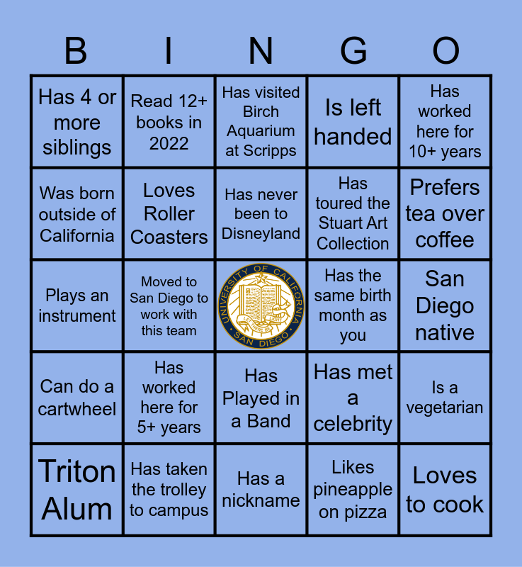 This bingo card has a free space and 29 words: Triton Alum, Has a Dog, Moved to San Diego to work with this team, Joined University Development <1 year ago, Has 4 or more siblings, Has visited Birch Aquarium at Scripps, Loves Roller Coasters, Has worked here for 5+ years, Has the same birth month as you, Has taken the trolley to campus, San Diego native, Loves to cook, Has a nickname, Likes pineapple on pizza, Prefers tea over coffee, Has Surfed La Jolla Shores, Has Played in a Band, Can do a cartwheel, Has worked here for 10+ years, Plays an instrument, Has met a celebrity, Has traveled to 4+ continents, Has toured the Stuart Art Collection, Was born outside of California, Is left handed, Read 12+ books in 2022, Is a vegetarian, Has never been to Disneyland and Can tell you a work-appropriate joke.
