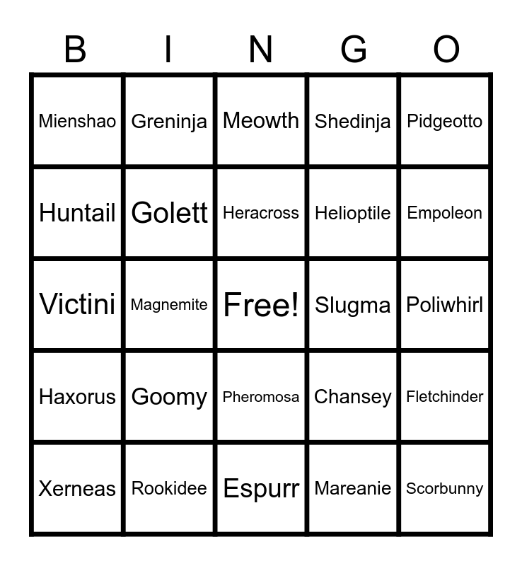 This bingo card has a free space and 24 words: Xerneas, Goomy, Heracross, Mareanie, Pidgeotto, Mienshao, Greninja, Meowth, Slugma, Poliwhirl, Victini, Golett, Chansey, Fletchinder, Huntail, Rookidee, Espurr, Shedinja, Empoleon, Haxorus, Magnemite, Pheromosa, Helioptile and Scorbunny.