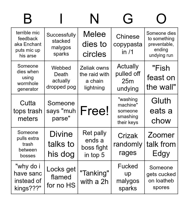 This bingo card has a free space and 38 words: Scotte Pulled Aggro / calls for salv, Crowe complains about healing parse, Webbed Death Didn't Drop, Webbed Death actually dropped pog, Zoomer talk from Edgy, Divine talks to his dog, Zeliak owns the raid with a chain lightning, Mike forgets to log or theres a "bug", Someone dies to something preventable, ending undying run, Actually pulled off 25m undying, Someone says "muh parse", Chinese copypasta in /1, Someone gets cucked on loatheb spores, Gluth eats a chow, Someone dies when using wormhole generator, Someone pulls extra trash between bosses, Priests fuck up MC on razuvius, Melee dies to circles, DK gives us the people's elbow, "washing machine" someone smashing their keys, terrible mic feedback aka Enchant puts mic up his arse, Locks get flamed for no HS, "Fish feast on the wall", "why do i have sanc instead of kings???", Someone pulls extra trash on KT, "Tanking" with a 2h, Someone misses jump to thaddius, DPS asks for innervate, Someone falls off the pipe to gluth, "CLEAR COMMS", wiping on trash....trash, Ret pally ends a boss fight in top 5, Fucked up malygos sparks, Successfully stacked malygos sparks, FPS complaints, Crizak randomly rages, Cutta tops trash meters and "my dk out dps's this whole raid" - intox.