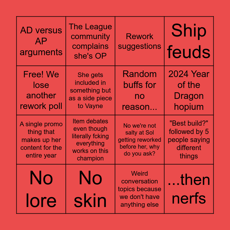 This bingo card has 16 words: No skin, "Best build?" followed by 5 people saying different things, Rework suggestions, AD versus AP arguments, A single promo thing that makes up her content for the entire year, The League community complains she's OP, No we're not salty at Sol getting reworked before her, why do you ask?, Weird conversation topics because we don't have anything else, Free! We lose another rework poll, She gets included in something but as a side piece to Vayne, No lore, Ship feuds, Item debates even though literally fcking everything works on this champion, 2024 Year of the Dragon hopium, Random buffs for no reason... and ...then nerfs.