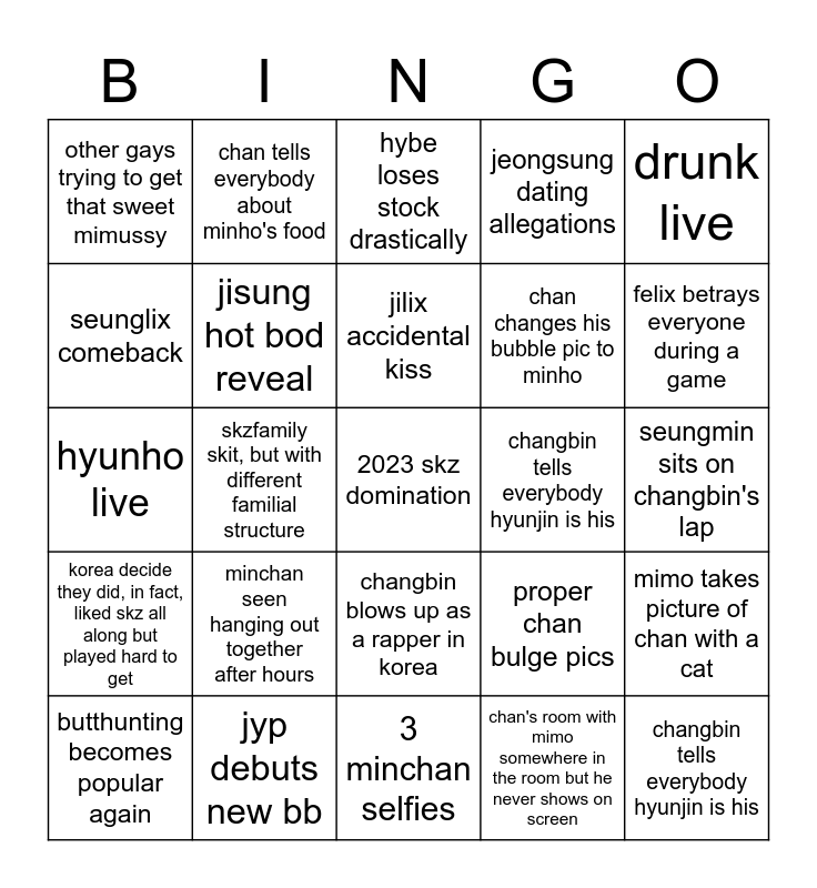 This bingo card has a free space and 24 words: minchan seen hanging out together after hours, jyp debuts new bb, jilix accidental kiss, butthunting becomes popular again, drunk live, other gays trying to get that sweet mimussy, seunglix comeback, chan tells everybody about minho's food, changbin tells everybody hyunjin is his, changbin blows up as a rapper in korea, chan changes his bubble pic to minho, hyunho live, proper chan bulge pics, mimo takes picture of chan with a cat, jisung hot bod reveal, chan's room with mimo somewhere in the room but he never shows on screen, seungmin sits on changbin's lap, hybe loses stock drastically, felix betrays everyone during a game, skzfamily skit, but with different familial structure, changbin tells everybody hyunjin is his, korea decide they did, in fact, liked skz all along but played hard to get, jeongsung dating allegations and 3 minchan selfies.