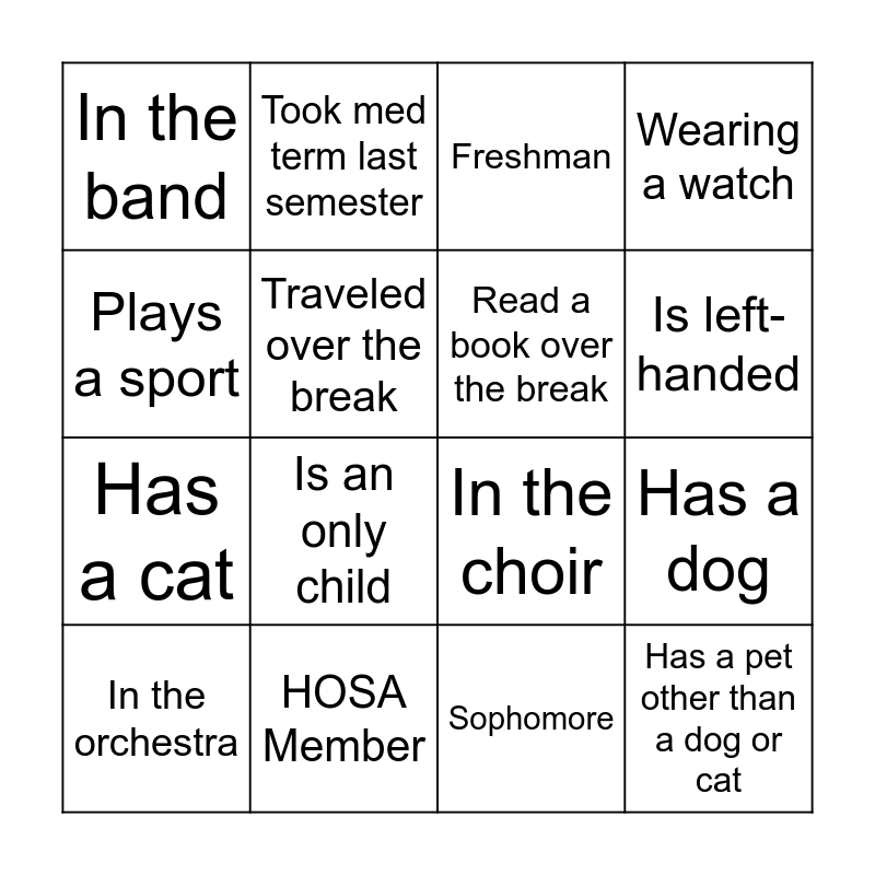 This bingo card has 16 words: HOSA Member, Has a dog, Freshman, In the band, Has a cat, Took med term last semester, In the choir, Sophomore, Plays a sport, Traveled over the break, In the orchestra, Wearing a watch, Is an only child, Is left-handed, Read a book over the break and Has a pet other than a dog or cat.
