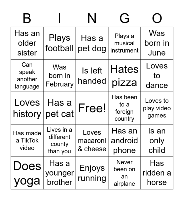 This bingo card has a free space and 24 words: Lives in a different county than you, Has a younger brother, Is left handed, Does yoga, Was born in June, Has an older sister, Can speak another language, Plays football, Has been to a foreign country, Loves macaroni & cheese, Hates pizza, Loves history, Has an android phone, Is an only child, Was born in February, Never been on an airplane, Loves to play video games, Has a pet dog, Loves to dance, Has a pet cat, Has ridden a horse, Has made a TikTok video, Plays a musical instrument and Enjoys running.