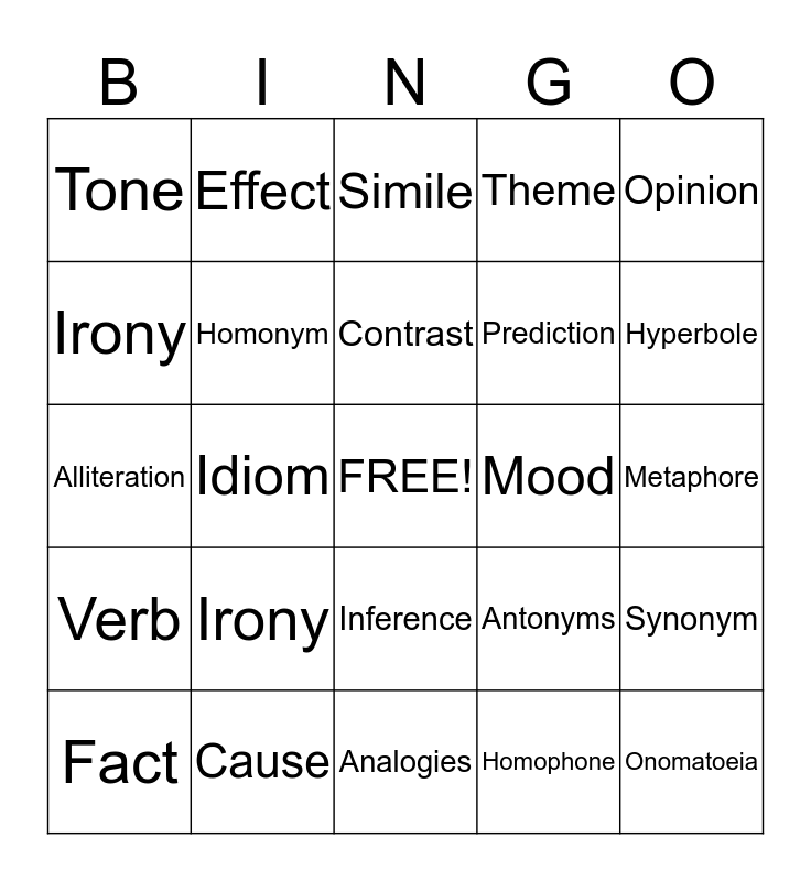 This bingo card has a free space and 24 words: Irony, Cause, Contrast, Fact, Opinion, Tone, Irony, Effect, Mood, Inference, Prediction, Alliteration, Antonyms, Synonym, Homonym, Homophone, Metaphore, Simile, Hyperbole, Idiom, Onomatoeia, Verb, Theme and Analogies.