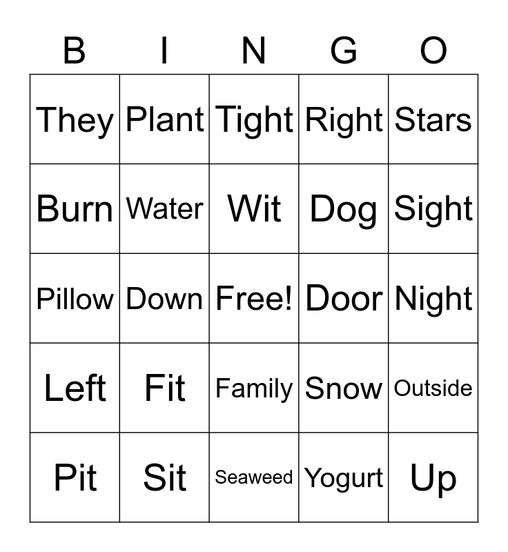 This bingo card has a free space and 24 words: Fit, Sit, Wit, Pit, Stars, They, Burn, Plant, Door, Family, Dog, Pillow, Snow, Outside, Water, Yogurt, Night, Tight, Sight, Down, Up, Left, Right and Seaweed.