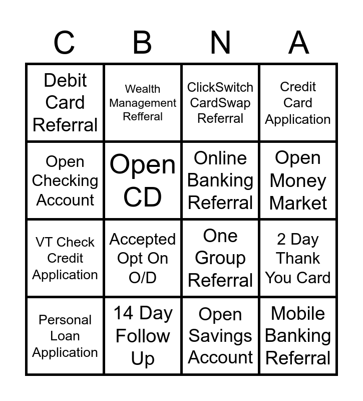 This bingo card has 16 words: 14 Day Follow Up, 2 Day Thank You Card, ClickSwitch CardSwap Referral, Debit Card Referral, VT Check Credit Application, Wealth Management Refferal, One Group Referral, Open Savings Account, Open Checking Account, Open CD, Personal Loan Application, Credit Card Application, Accepted Opt On O/D, Open Money Market, Online Banking Referral and Mobile Banking Referral.