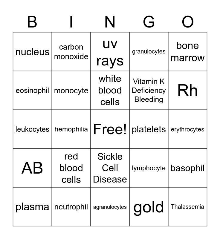 This bingo card has a free space and 24 words: plasma, red blood cells, white blood cells, gold, bone marrow, nucleus, carbon monoxide, uv rays, platelets, erythrocytes, leukocytes, monocyte, lymphocyte, basophil, eosinophil, neutrophil, agranulocytes, granulocytes, Rh, AB, hemophilia, Sickle Cell Disease, Vitamin K Deficiency Bleeding and Thalassemia.