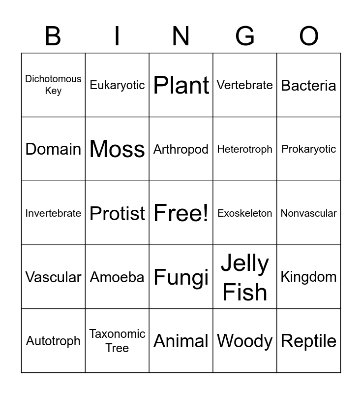 This bingo card has a free space and 25 words: Amoeba, Animal, Arthropod, Autotroph, Bacteria, Dichotomous Key, Domain, Eukaryotic, Exoskeleton, Fungi, Heterotroph, Invertebrate, Jelly Fish, Kingdom, Moss, Mushroom, Nonvascular, Plant, Prokaryotic, Protist, Reptile, Taxonomic Tree, Vascular, Vertebrate and Woody.