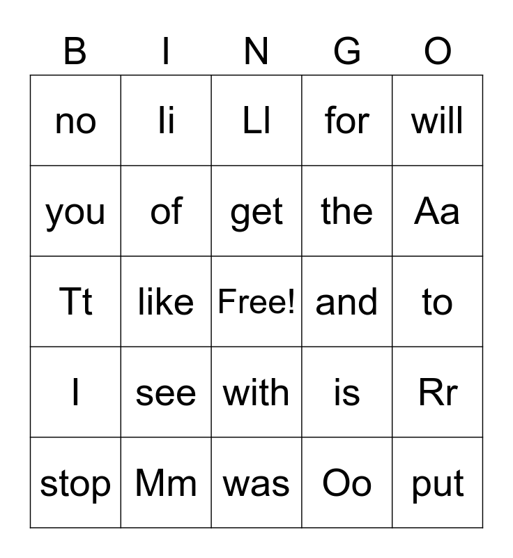 This bingo card has a free space and 39 words: in, want, said, of, stop, with, get, go, will, I, like, for, put, to, and, see, orange, no, a, is, you, was, the, Aa, Bb, Cc, Dd, Gg, Hh, Ii, Jj, Kk, Ll, Mm, Oo, Pp, Rr, Tt and Uu.