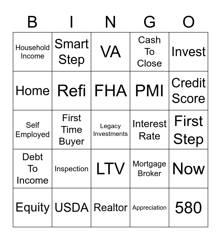 This bingo card has a free space and 39 words: Down Payment Assistance, Pre-Approved, Home Appraisal, Refi, Equity, LTV, FHA, Conventional, Invest, Debt To Income, First Time Buyer, Cash To Close, 580, First Step, Interest Rate, Inspection, Title Insurance, Household Income, Negotiating Power, Mortgage Broker, Home, Realtor, PMI, Credit Score, Seller, 3.5%, Financing, Tax Credit, 3-2-1 buydown, Smart Step, Preferred, Wealth Building, VA, USDA, Appreciation, Buyer, Now, Self Employed and 7%.