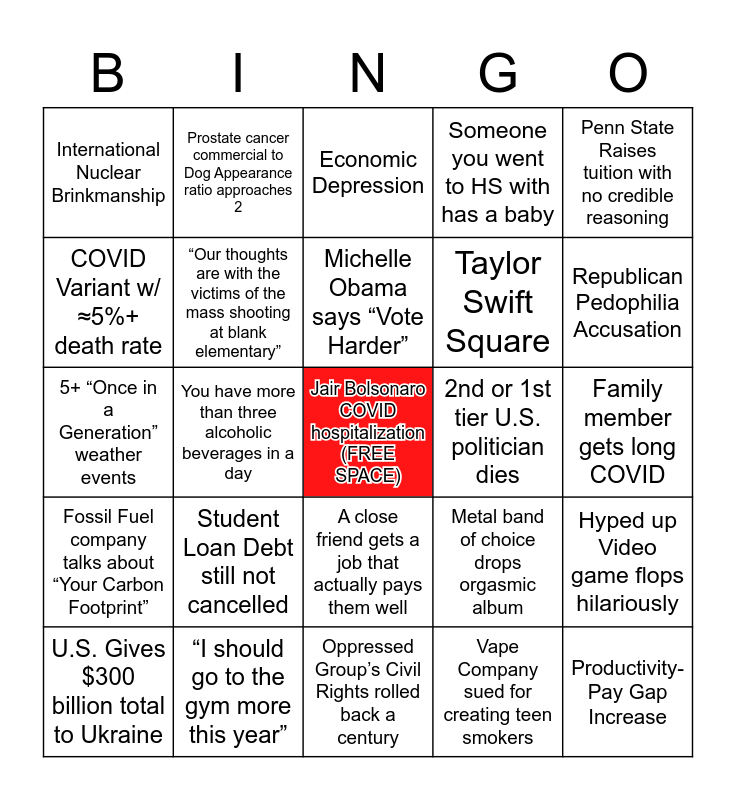 This bingo card has a free space and 24 words: Student Loan Debt still not cancelled, “I should go to the gym more this year”, Michelle Obama says “Vote Harder”, U.S. Gives $300 billion total to Ukraine, Penn State Raises tuition with no credible reasoning, International Nuclear Brinkmanship, COVID Variant w/≈5%+ death rate, Prostate cancer commercial to Dog Appearance ratio approaches 2, 2nd or 1st tier U.S. politician dies, A close friend gets a job that actually pays them well, Taylor Swift Square, 5+ “Once in a Generation” weather events, Metal band of choice drops orgasmic album, Hyped up Video game flops hilariously, “Our thoughts are with the victims of the mass shooting at blank elementary”, Vape Company sued for creating teen smokers, Family member gets long COVID, Economic Depression, Republican Pedophilia Accusation, You have more than three alcoholic beverages in a day, Productivity-Pay Gap Increase, Fossil Fuel company talks about “Your Carbon Footprint”, Someone you went to HS with has a baby and Oppressed Group’s Civil Rights rolled back a century.