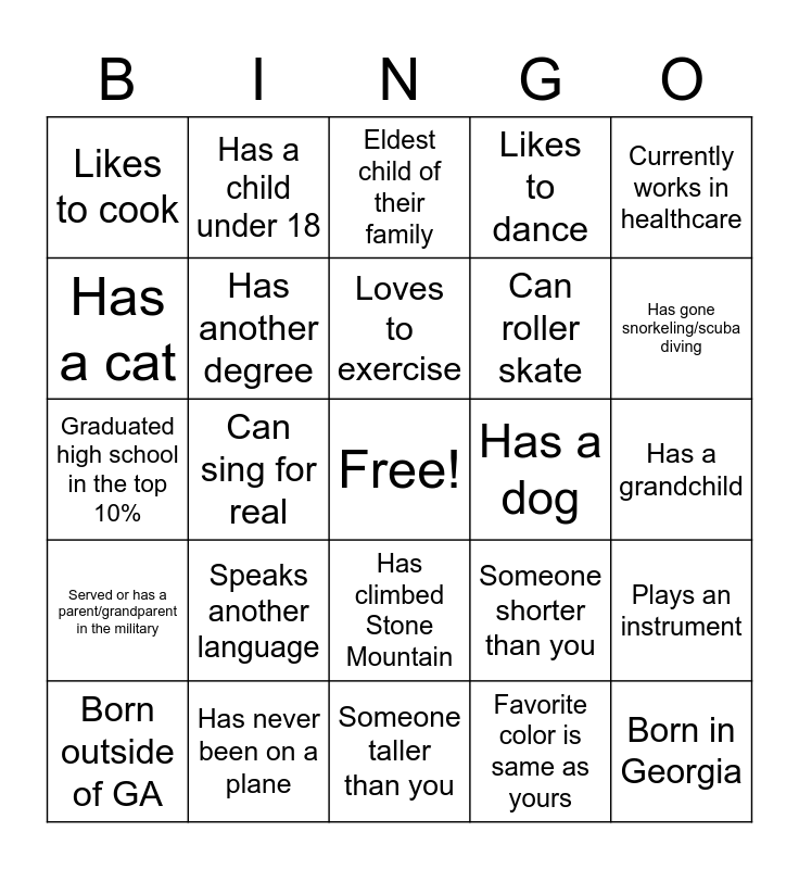 This bingo card has a free space and 34 words: Is an only child, Favorite color is same as yours, Has traveled outside of the USA, Likes to go fishing, Served or has a parent/grandparent in the military, Has another degree, Currently works in healthcare, Born outside of GA, Has a child under 18, Born in the same month as you, Loves to exercise, Eldest child of their family, Currently married, Does not have a DL, Has a dog, Has gone snorkeling/scuba diving, Has never been on a plane, Graduated high school in the top 10%, Speaks another language, Someone shorter than you, Has climbed Stone Mountain, Youngest child in their family, Likes to cook, Has a grandchild, Someone taller than you, Born in Georgia, Likes to dance, Lives on campus, Can roller skate, Has a cat, Terrified of animals, Can sing for real, Plays an instrument and Never received a speeding ticket.