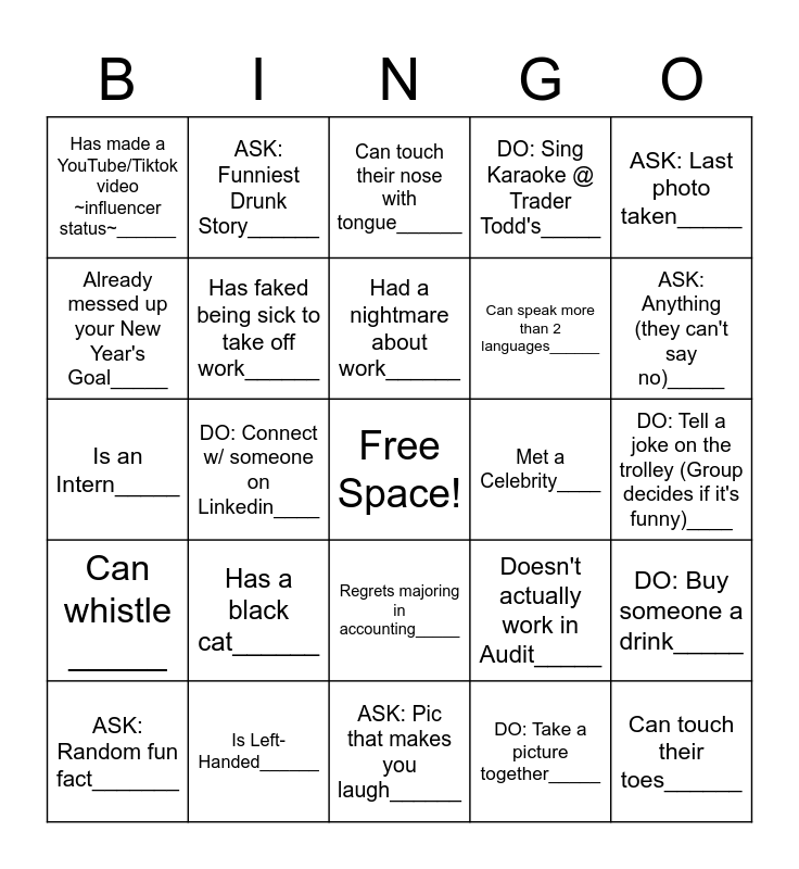 This bingo card has a free space and 24 words: Has a black cat______, Is Left-Handed______, Had a nightmare about work______, ASK: Random fun fact_______, ASK: Last photo taken_____, Has made a YouTube/Tiktok video ~influencer status~______, Already messed up your New Year's Goal_____, ASK: Funniest Drunk Story______, Met a Celebrity____, Regrets majoring in accounting_____, Can speak more than 2 languages______, Is an Intern_____, Doesn't actually work in Audit_____, DO: Buy someone a drink_____, Has faked being sick to take off work______, DO: Take a picture together_____, DO: Tell a joke on the trolley (Group decides if it's funny)____, Can touch their nose with tongue______, ASK: Anything (they can't say no)_____, DO: Connect w/ someone on Linkedin____, Can touch their toes______, Can whistle _____, DO: Sing Karaoke @ Trader Todd's_____ and ASK: Pic that makes you laugh______.