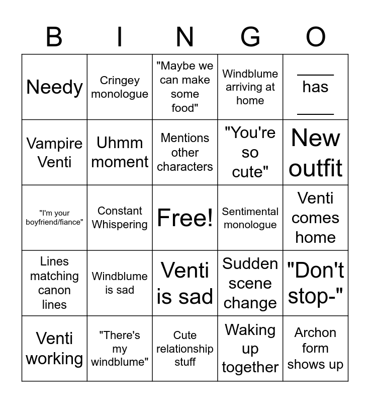 This bingo card has a free space and 59 words: "You know", "There's my windblume", Cringey complement, Sentimental monologue, Archon form shows up, Excessive making out, Uhmm moment, Laying down, Windblume arriving at home, Drunk, Vampire Venti, Idol Venti, Mentions other characters, Mentions past events, Out of character, Needy, Constant Whispering, "Maybe we can make some food", Falling asleep together, New outfit, "I'm your boyfriend/fiance", Cringey monologue, Giggles, Waking up together, Sus lines, Wholesome compliment/moment, Bold windblume, "There's that smile", "You're so cute", Lyre playing, Demo lyre, At home, Outside, New location, ____ has ____, Venti working, Mentions commissions, Cute relationship stuff, Door sound, Venti comes home, And~, Windblume is sad, Venti is sad, Venti is "angry", "You're my ___…", Mentions alcohol, Background noise loop, "got you~", Sudden scene change, "Don't stop-", "Relax", Iconic moment/line, never repeated, "Like the winds to the sea…", Random angst, "I love you" repeatedly, Lines matching canon lines, Guest va's, Too much Heavy breathing and Red flag.