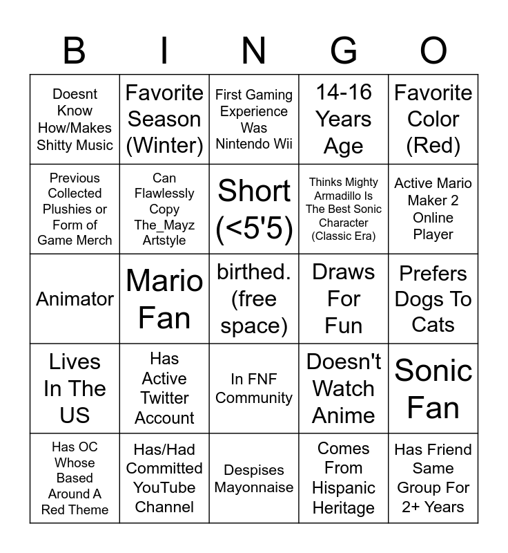 This bingo card has a free space and 24 words: Has Active Twitter Account, Has/Had Committed YouTube Channel, Short (<5'5), Has OC Whose Based Around A Red Theme, Favorite Color (Red), Doesnt Know How/Makes Shitty Music, Previous Collected Plushies or Form of Game Merch, Favorite Season (Winter), Draws For Fun, In FNF Community, Thinks Mighty Armadillo Is The Best Sonic Character (Classic Era), Animator, Doesn't Watch Anime, Sonic Fan, Can Flawlessly Copy The_Mayz Artstyle, Comes From Hispanic Heritage, Prefers Dogs To Cats, First Gaming Experience Was Nintendo Wii, Active Mario Maker 2 Online Player, Mario Fan, Has Friend Same Group For 2+ Years, Lives In The US, 14-16 Years Age and Despises Mayonnaise.