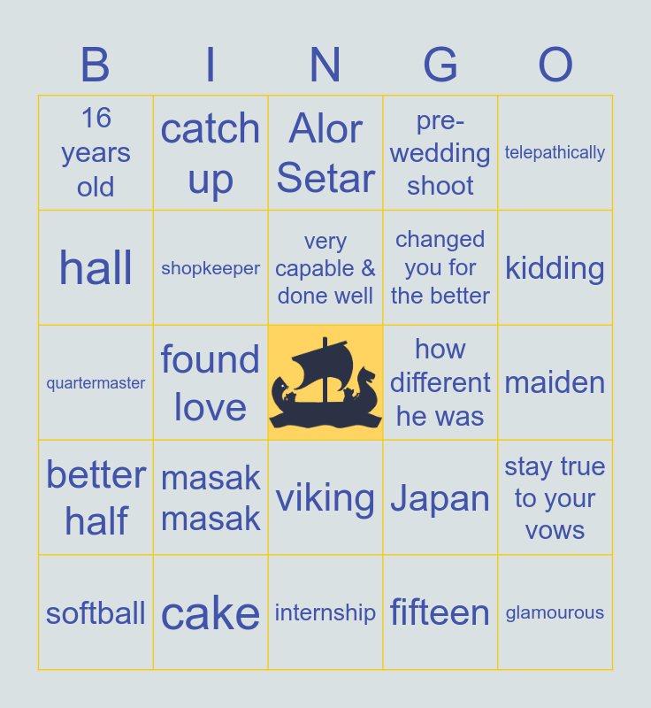 This bingo card has a free space and 24 words: masak masak, cake, very capable & done well, softball, telepathically, 16 years old, hall, catch up, how different he was, viking, changed you for the better, quartermaster, Japan, stay true to your vows, shopkeeper, fifteen, maiden, Alor Setar, kidding, found love, glamourous, better half, pre-wedding shoot and internship.