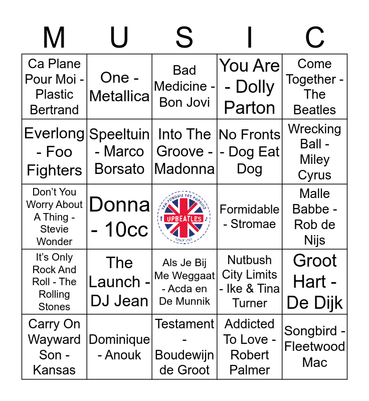 This bingo card has a free space and 24 words: The Launch - DJ Jean, Dominique - Anouk, Into The Groove - Madonna, Carry On Wayward Son - Kansas, Come Together - The Beatles, Ca Plane Pour Moi - Plastic Bertrand, Everlong - Foo Fighters, One - Metallica, Formidable - Stromae, Als Je Bij Me Weggaat - Acda en De Munnik, No Fronts - Dog Eat Dog, Don’t You Worry About A Thing - Stevie Wonder, Nutbush City Limits - Ike & Tina Turner, Groot Hart - De Dijk, Speeltuin - Marco Borsato, Addicted To Love - Robert Palmer, Malle Babbe - Rob de Nijs, Bad Medicine - Bon Jovi, Wrecking Ball - Miley Cyrus, Donna - 10cc, Songbird - Fleetwood Mac, It’s Only Rock And Roll - The Rolling Stones, You Are - Dolly Parton and Testament - Boudewijn de Groot.