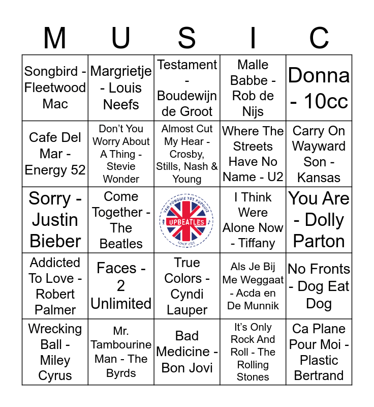 This bingo card has a free space and 24 words: Faces - 2 Unlimited, Mr. Tambourine Man - The Byrds, Almost Cut My Hear - Crosby, Stills, Nash & Young, Wrecking Ball - Miley Cyrus, Donna - 10cc, Songbird - Fleetwood Mac, Cafe Del Mar - Energy 52, Margrietje - Louis Neefs, I Think Were Alone Now - Tiffany, True Colors - Cyndi Lauper, Where The Streets Have No Name - U2, Sorry - Justin Bieber, Als Je Bij Me Weggaat - Acda en De Munnik, No Fronts - Dog Eat Dog, Don’t You Worry About A Thing - Stevie Wonder, It’s Only Rock And Roll - The Rolling Stones, You Are - Dolly Parton, Testament - Boudewijn de Groot, Carry On Wayward Son - Kansas, Come Together - The Beatles, Ca Plane Pour Moi - Plastic Bertrand, Addicted To Love - Robert Palmer, Malle Babbe - Rob de Nijs and Bad Medicine - Bon Jovi.