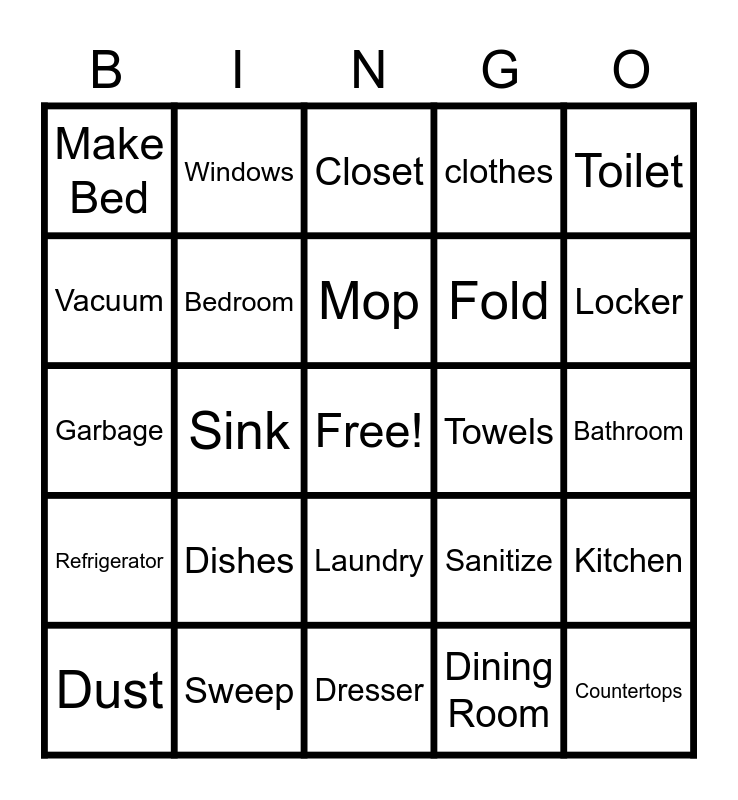This bingo card has a free space and 24 words: Dishes, Sweep, Mop, Dust, Toilet, Make Bed, Vacuum, Windows, Towels, Laundry, Fold, Garbage, Sanitize, Kitchen, Bedroom, Dining Room, Bathroom, Closet, Locker, Sink, Countertops, Refrigerator, clothes and Dresser.