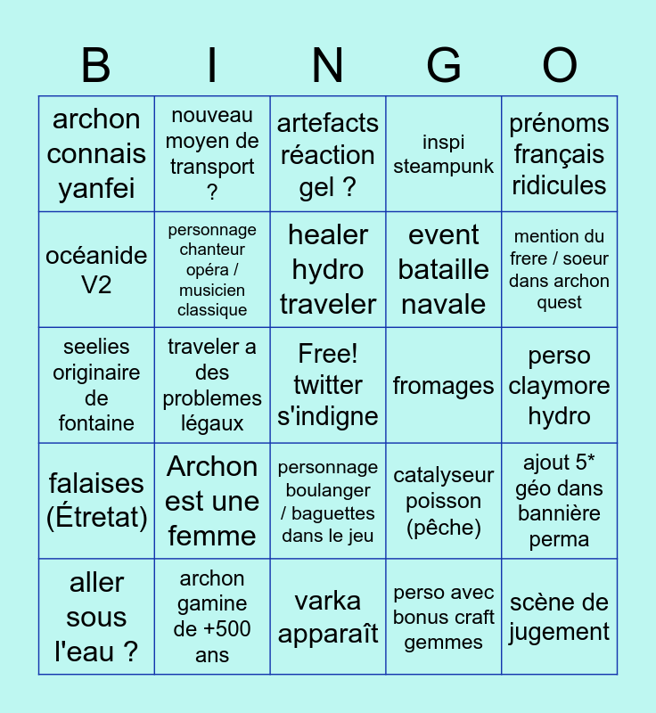 This bingo card has a free space and 24 words: Archon est une femme, archon gamine de +500 ans, healer hydro traveler, aller sous l'eau ?, prénoms français ridicules, archon connais yanfei, océanide V2, nouveau moyen de transport ?, fromages, personnage boulanger / baguettes dans le jeu, event bataille navale, seelies originaire de fontaine, catalyseur poisson (pêche), ajout 5* géo dans bannière perma, personnage chanteur opéra / musicien classique, perso avec bonus craft gemmes, perso claymore hydro, artefacts réaction gel ?, mention du frere / soeur dans archon quest, traveler a des problemes légaux, scène de jugement, falaises (Étretat), inspi steampunk and varka apparaît.