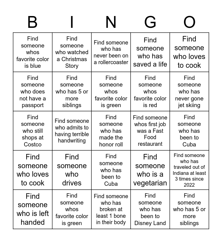 This bingo card has 50 words: Find someone who has worked over break, Find someone who has made the honor roll, Find someone who went out of town for break, Find someone who has broken at least 1 bone in their body, Find someone who drives, Find someone who played a varsity/college level sport, Find someone who watched a Christmas Story, Find someone who likes Cats better than Dogs, Find someone who does not have a passport, Find someone who has traveled to at least 4 states, Find someone who has 5 or more siblings, Find someone who has saved a life, Find someone who has traveled out of Indiana at least 3 times since 2022, Find someone who is a vegetarian, Find someone who has a sibling at LC, Find someone whos favorite color is blue, Find someone whos favorite color is green, Find someone whos first job was a Fast Food restaurant, Find someone who has never gone jet skiing, Find someone who loves to cook, Find someone who admits to having terrible handwriting, Find someone who has been to Disney Land, Find someone whos favorite color is blue, Find someone whos favorite color is red, Find someone whos favorite color is white, Find someone who has 5 or more siblings, Find someone who has never gone jet skiing, Find someone who has traveled to at least 4 countries, Find someone who has never been on a rollercoaster, Find someone who has been to Cuba, Find someone who likes Cats better than Dogs, Find someone who does not have a passport, Find someone who watches Game of Thrones, Find someone who has never been to Disney, Find someone whos favorite color is green, Find someone who has never gone jet skiing, Find someone whos favorite color is red, Find someone who still shops at Costco, Find someone who is afraid of heights, Find someone who has been to Cuba, Find someone that is allergic to avocado, Find someone that speaks more than 2 languages, Find someone who has never been to Disney, Find someone who loves to cook, Find someone who is left handed, Find someone who still shops at Costco, Find someone who has owned a motorcycle, Find someone whos birthday is on a holiday, Find someone who loves to cook and Find someone who has never been to Disney.