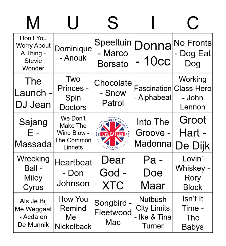 This bingo card has a free space and 24 words: Heartbeat - Don Johnson, How You Remind Me - Nickelback, Chocolate - Snow Patrol, Als Je Bij Me Weggaat - Acda en De Munnik, No Fronts - Dog Eat Dog, Don’t You Worry About A Thing - Stevie Wonder, The Launch - DJ Jean, Dominique - Anouk, Into The Groove - Madonna, Dear God - XTC, Fascination - Alphabeat, Sajang E - Massada, Pa - Doe Maar, Lovin’ Whiskey - Rory Block, Two Princes - Spin Doctors, Nutbush City Limits - Ike & Tina Turner, Groot Hart - De Dijk, Speeltuin - Marco Borsato, Working Class Hero - John Lennon, We Don’t Make The Wind Blow - The Common Linnets, Isn’t It Time - The Babys, Wrecking Ball - Miley Cyrus, Donna - 10cc and Songbird - Fleetwood Mac.