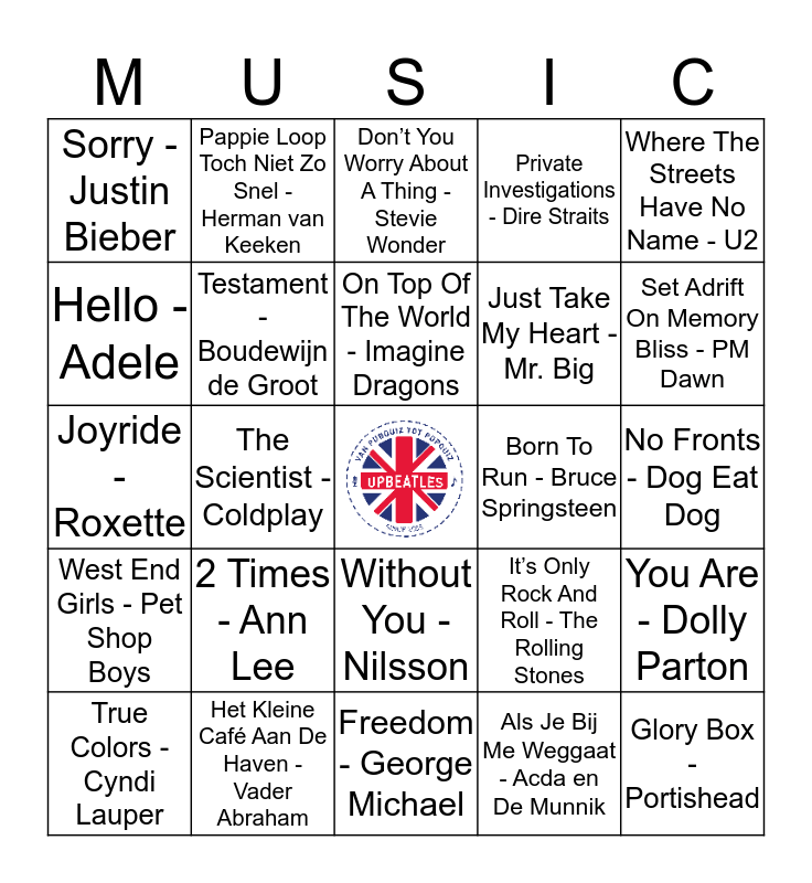 This bingo card has a free space and 24 words: 2 Times - Ann Lee, Het Kleine Café Aan De Haven - Vader Abraham, On Top Of The World - Imagine Dragons, True Colors - Cyndi Lauper, Where The Streets Have No Name - U2, Sorry - Justin Bieber, Hello - Adele, Pappie Loop Toch Niet Zo Snel - Herman van Keeken, Born To Run - Bruce Springsteen, Without You - Nilsson, Just Take My Heart - Mr. Big, Joyride - Roxette, It’s Only Rock And Roll - The Rolling Stones, You Are - Dolly Parton, Testament - Boudewijn de Groot, Als Je Bij Me Weggaat - Acda en De Munnik, No Fronts - Dog Eat Dog, Don’t You Worry About A Thing - Stevie Wonder, Set Adrift On Memory Bliss - PM Dawn, The Scientist - Coldplay, Glory Box - Portishead, West End Girls - Pet Shop Boys, Private Investigations - Dire Straits and Freedom - George Michael.