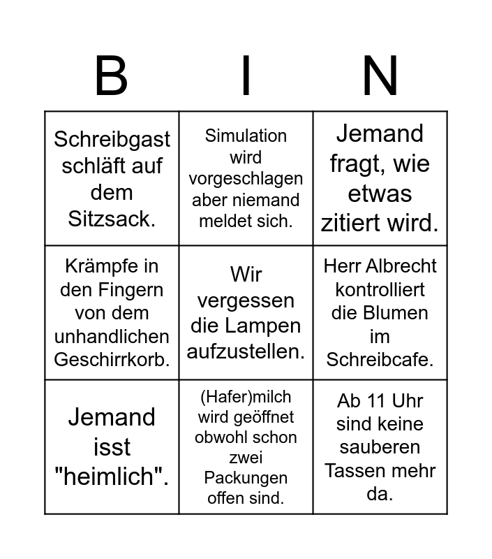 This bingo card has a free space and 8 words: Herr Albrecht kontrolliert die Blumen im Schreibcafe., Jemand fragt, wie etwas zitiert wird., Simulation wird vorgeschlagen aber niemand meldet sich., Jemand isst "heimlich"., Schreibgast schläft auf dem Sitzsack., Ab 11 Uhr sind keine sauberen Tassen mehr da., Krämpfe in den Fingern von dem unhandlichen Geschirrkorb. and (Hafer)milch wird geöffnet obwohl schon zwei Packungen offen sind..