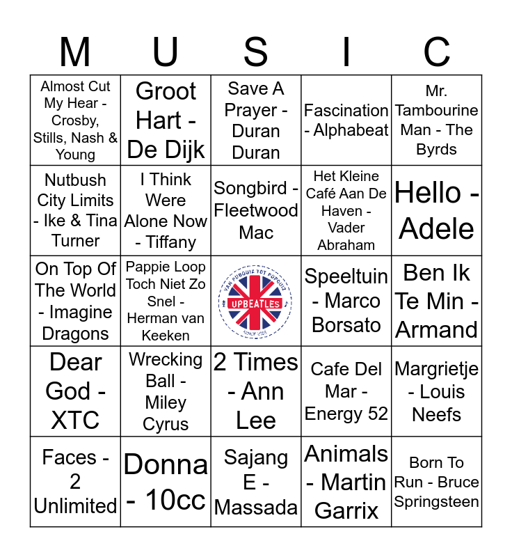 This bingo card has a free space and 24 words: Wrecking Ball - Miley Cyrus, Donna - 10cc, Songbird - Fleetwood Mac, Faces - 2 Unlimited, Mr. Tambourine Man - The Byrds, Almost Cut My Hear - Crosby, Stills, Nash & Young, Nutbush City Limits - Ike & Tina Turner, Groot Hart - De Dijk, Speeltuin - Marco Borsato, 2 Times - Ann Lee, Het Kleine Café Aan De Haven - Vader Abraham, On Top Of The World - Imagine Dragons, Cafe Del Mar - Energy 52, Margrietje - Louis Neefs, I Think Were Alone Now - Tiffany, Animals - Martin Garrix, Ben Ik Te Min - Armand, Save A Prayer - Duran Duran, Hello - Adele, Pappie Loop Toch Niet Zo Snel - Herman van Keeken, Born To Run - Bruce Springsteen, Dear God - XTC, Fascination - Alphabeat and Sajang E - Massada.