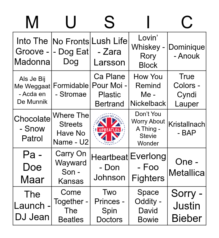 This bingo card has a free space and 24 words: Carry On Wayward Son - Kansas, Come Together - The Beatles, Ca Plane Pour Moi - Plastic Bertrand, The Launch - DJ Jean, Dominique - Anouk, Into The Groove - Madonna, Als Je Bij Me Weggaat - Acda en De Munnik, No Fronts - Dog Eat Dog, Don’t You Worry About A Thing - Stevie Wonder, Heartbeat - Don Johnson, How You Remind Me - Nickelback, Chocolate - Snow Patrol, Everlong - Foo Fighters, One - Metallica, Formidable - Stromae, Space Oddity - David Bowie, Kristallnach - BAP, Lush Life - Zara Larsson, True Colors - Cyndi Lauper, Where The Streets Have No Name - U2, Sorry - Justin Bieber, Pa - Doe Maar, Lovin’ Whiskey - Rory Block and Two Princes - Spin Doctors.