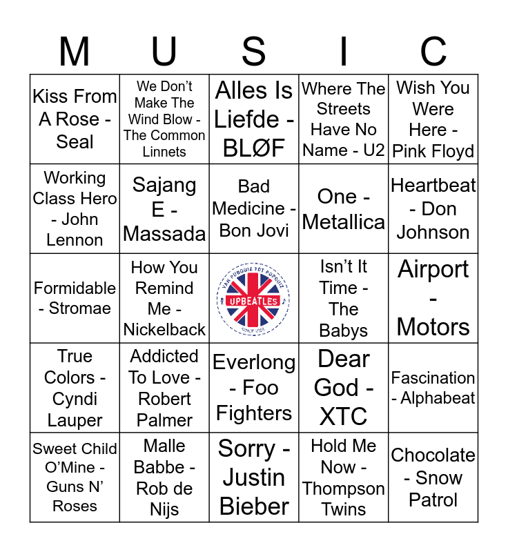 This bingo card has a free space and 24 words: Addicted To Love - Robert Palmer, Malle Babbe - Rob de Nijs, Bad Medicine - Bon Jovi, Sweet Child O’Mine - Guns N’ Roses, Wish You Were Here - Pink Floyd, Kiss From A Rose - Seal, Working Class Hero - John Lennon, We Don’t Make The Wind Blow - The Common Linnets, Isn’t It Time - The Babys, Everlong - Foo Fighters, One - Metallica, Formidable - Stromae, Dear God - XTC, Fascination - Alphabeat, Sajang E - Massada, Hold Me Now - Thompson Twins, Airport - Motors, Alles Is Liefde - BLØF, Heartbeat - Don Johnson, How You Remind Me - Nickelback, Chocolate - Snow Patrol, True Colors - Cyndi Lauper, Where The Streets Have No Name - U2 and Sorry - Justin Bieber.