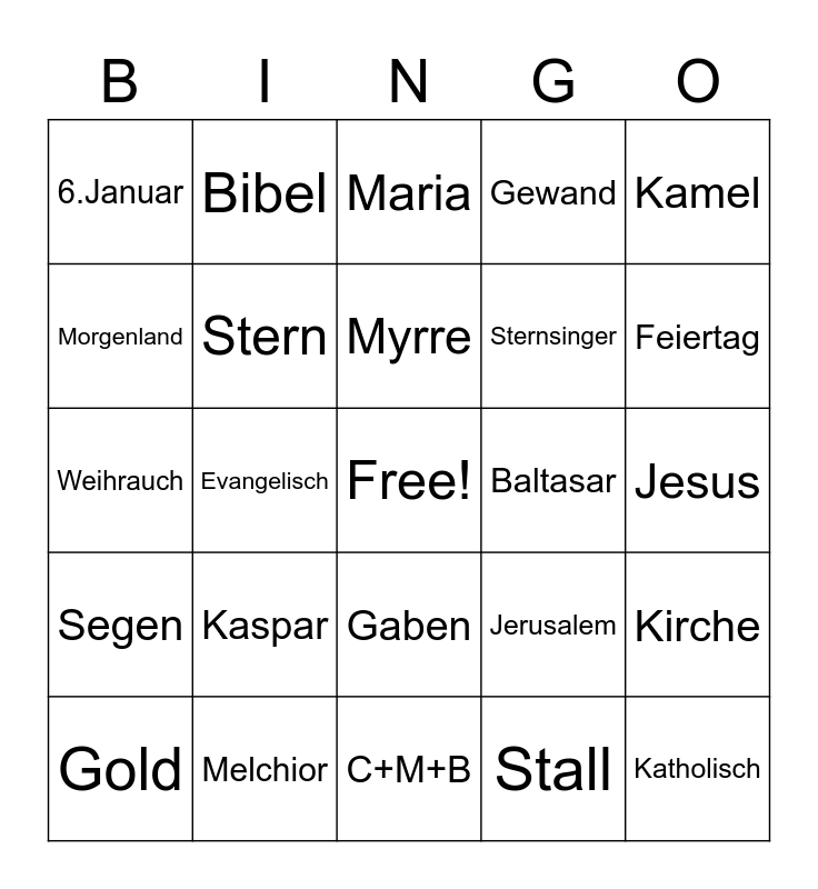 This bingo card has a free space and 24 words: Kaspar, Melchior, Myrre, Gold, Kamel, 6.Januar, Morgenland, Bibel, Baltasar, Gaben, Sternsinger, Weihrauch, Jerusalem, Kirche, Stern, Stall, Jesus, Maria, Feiertag, Evangelisch, Katholisch, Segen, Gewand and C+M+B.