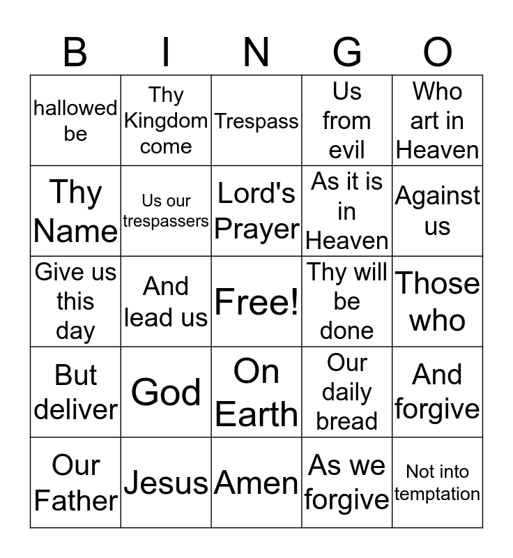This bingo card has a free space and 24 words: God, Jesus, Lord's Prayer, Our Father, Who art in Heaven, hallowed be, Thy Name, Thy Kingdom come, Thy will be done, On Earth, As it is in Heaven, Give us this day, Our daily bread, And forgive, Us our trespassers, As we forgive, Those who, Trespass, Against us, And lead us, Not into temptation, But deliver, Us from evil and Amen.