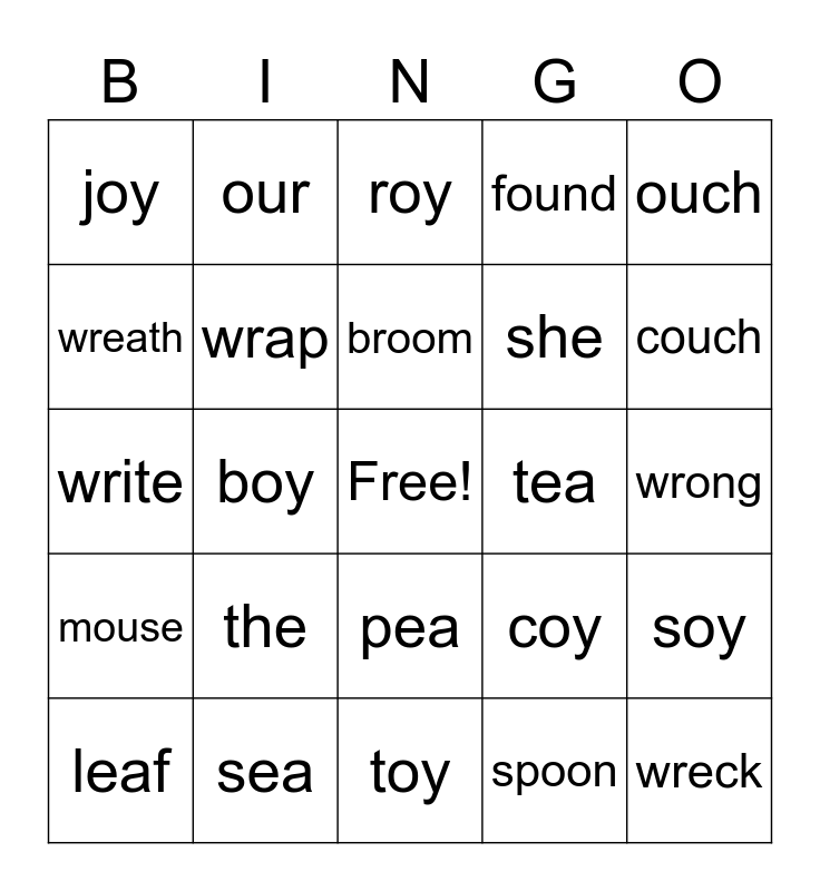 This bingo card has a free space and 24 words: the, sea, broom, leaf, ouch, joy, wreath, our, tea, pea, she, write, coy, soy, wrap, spoon, wrong, roy, couch, boy, wreck, mouse, found and toy.